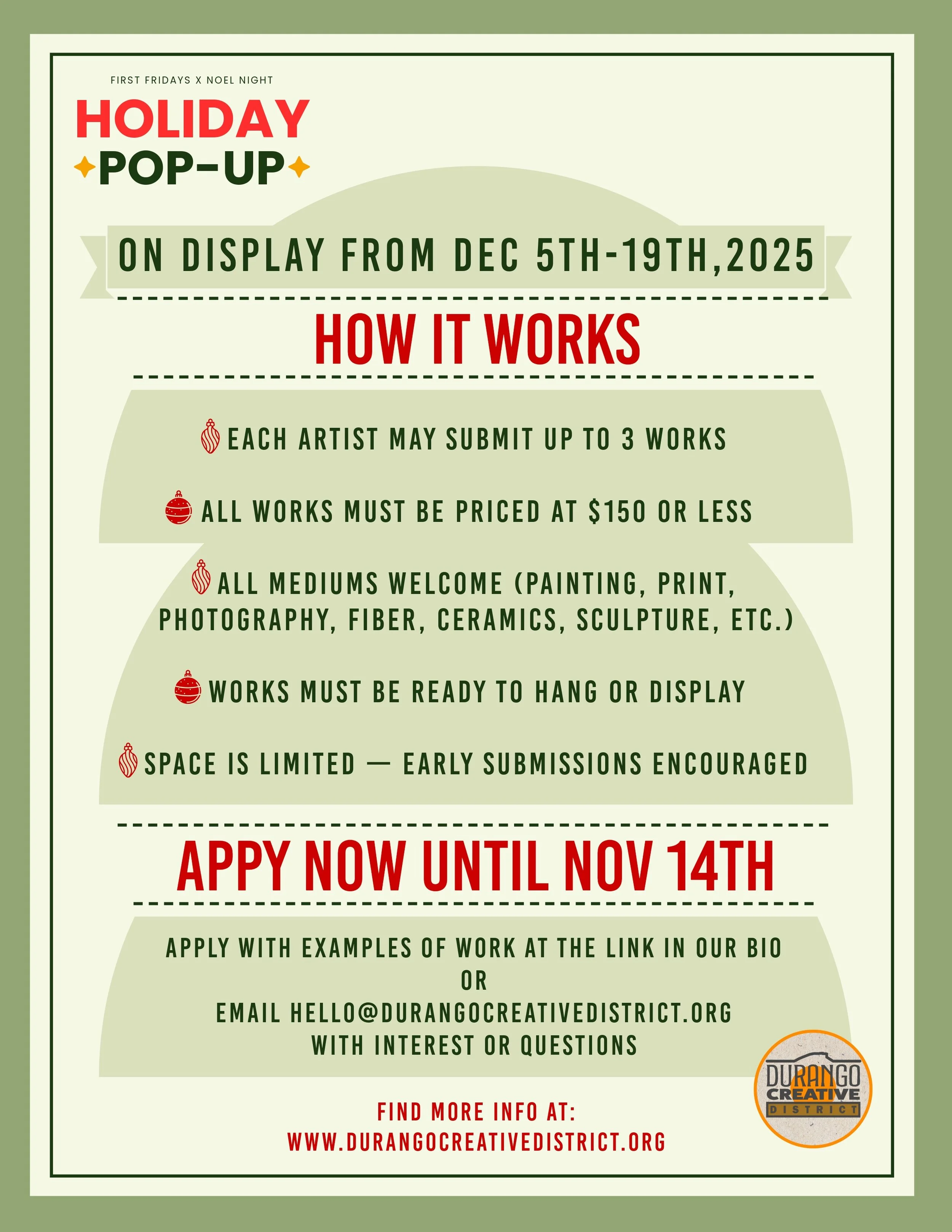 read the prospectus here Name * First Name Last Name Email * Introduce yourself and describe your work How Many works do you intend to display? Estimated size of works? Do you have a website/socials or online portfolio? Thank you!